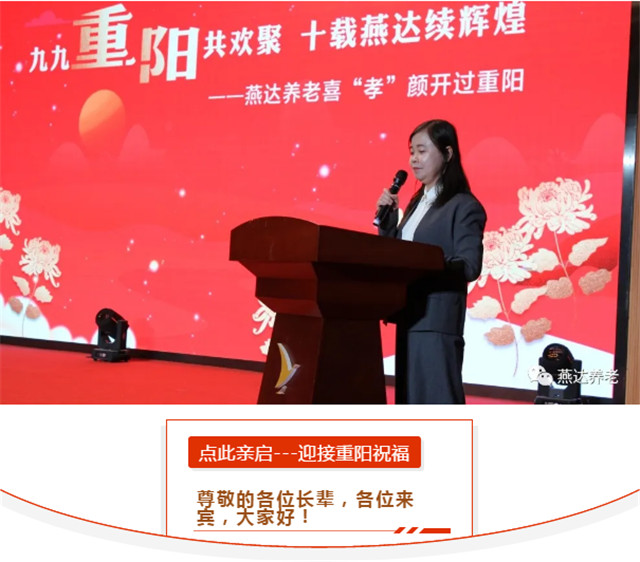 下午14點30整,“九九重陽共歡聚 ?十載燕達續輝煌——燕達養老喜‘孝’顏開過重陽”活動正式開始。燕達國際健康城副總裁李海燕女士隆重致辭。
